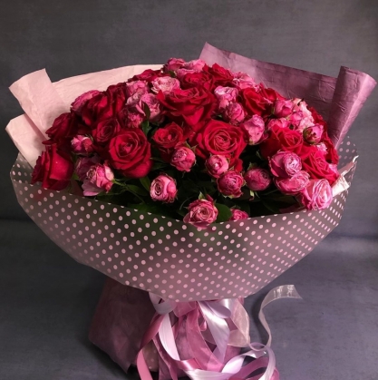 Восхитительный букет из кустовых пионовидных и одиночных эквадорских роз в стильной упаковке